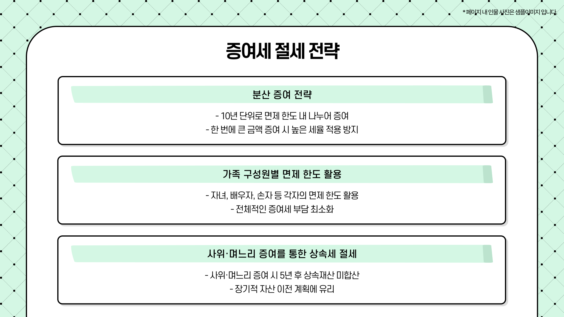 또한, 가족 구성원이 여러 명이라면 각자 면제 한도를 최대한 활용하는 것도 좋은 방법입니다. 예를 들어, 자녀에게 5,000만 원, 며느리에게 1,000만 원, 손자에게 5,000만 원 등 각각의 면제 한도를 활용해 증여하면 전체적으로 납부해야 할 세금을 크게 줄일 수 있습니다.